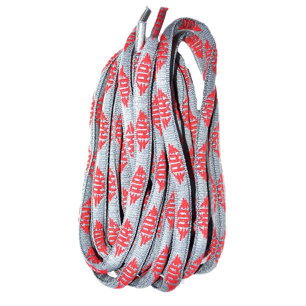 Features 2 laces per pack (1 pair) for each of your shoes. Laces are rounded with red stitching on grey laces. All over Aesop Rock logo pattern.