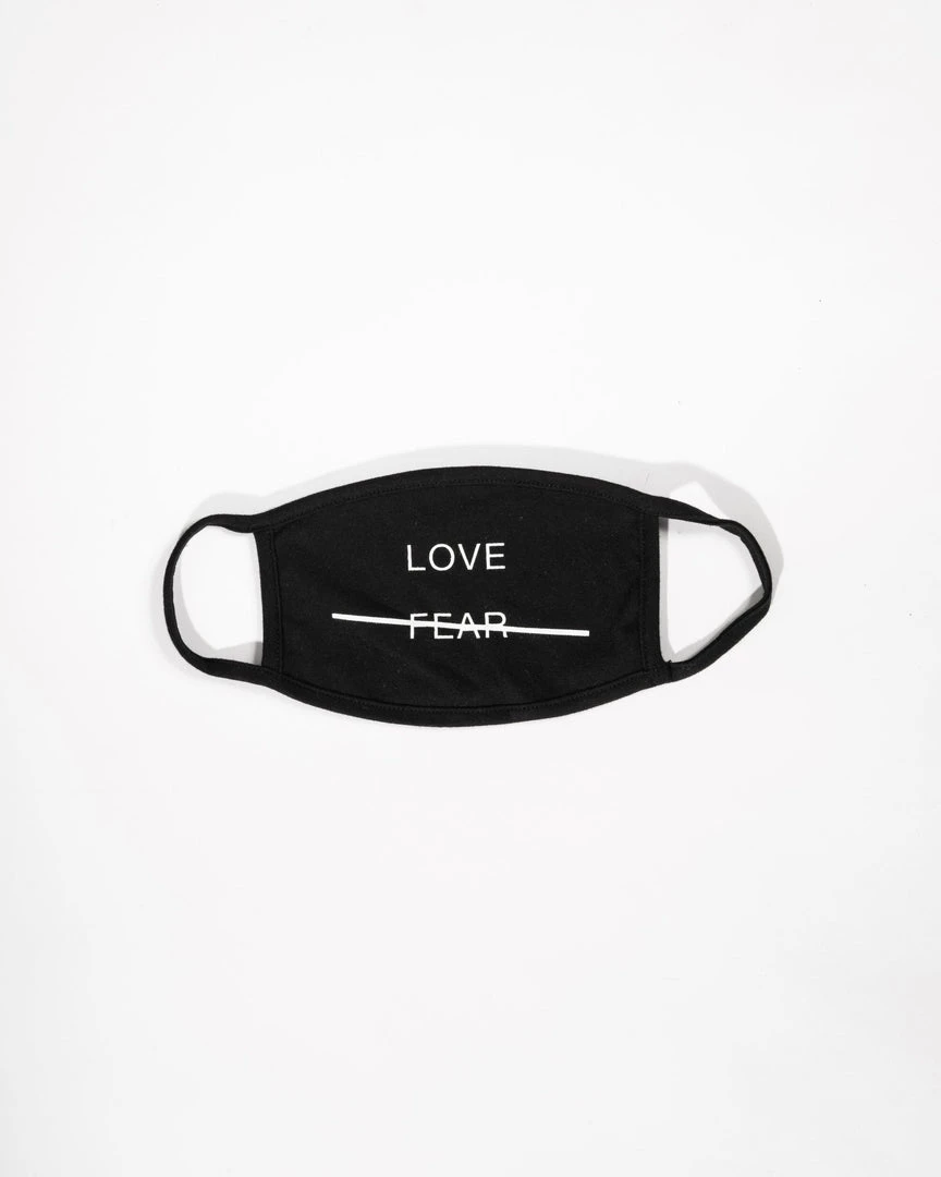 No fear, just love…and we’ll get through this.  Black cotton mask with screen printed love not fear graphic.