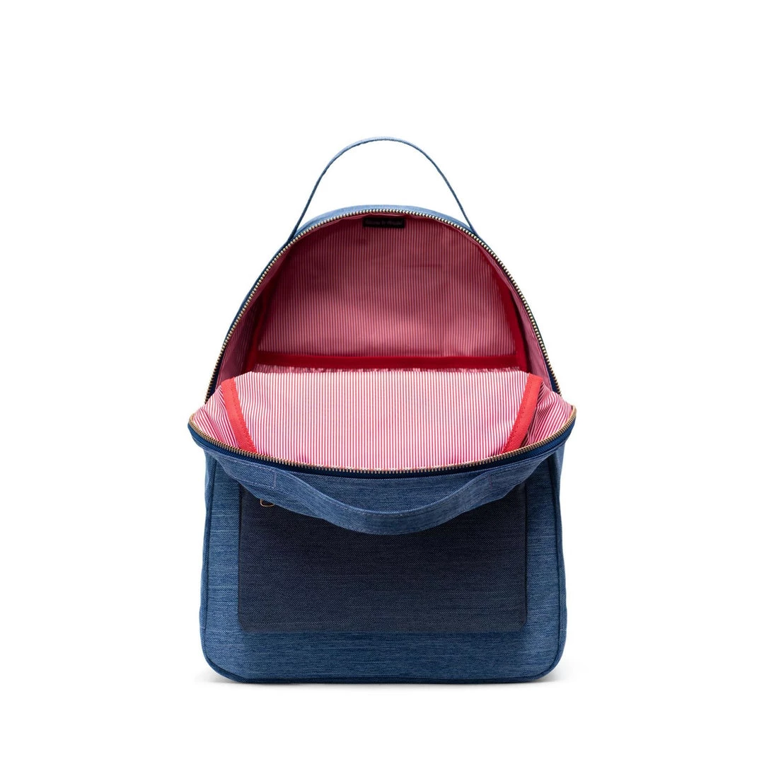 Herschel Nova Mid Volume backpack in denim. Classic compact backpack with dual carrying handles Signature striped fabric liner and dual water bottle pockets. Spacious main compartment for everyday essentials. Internal 13″ laptop storage sleeve and front pocket with key clip.