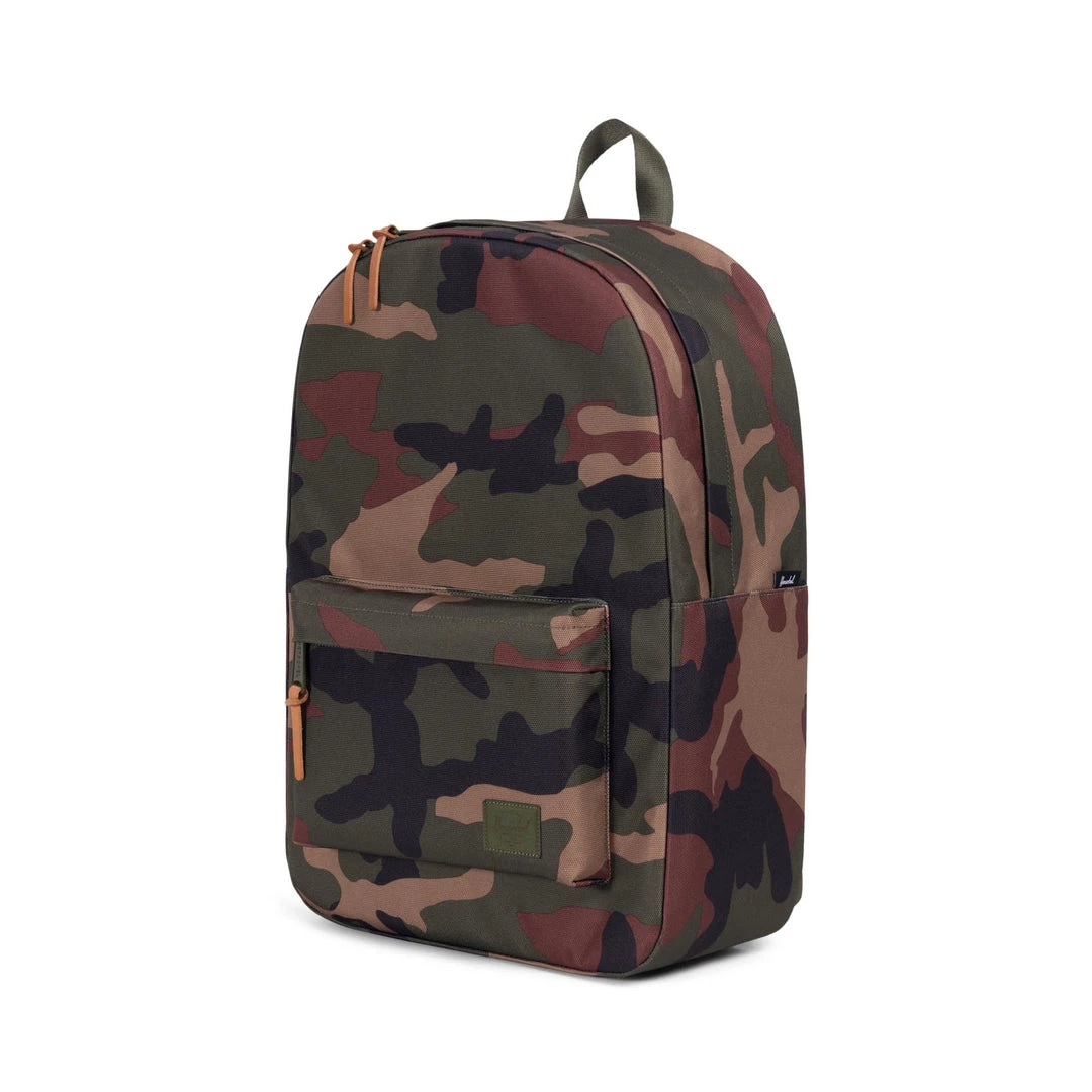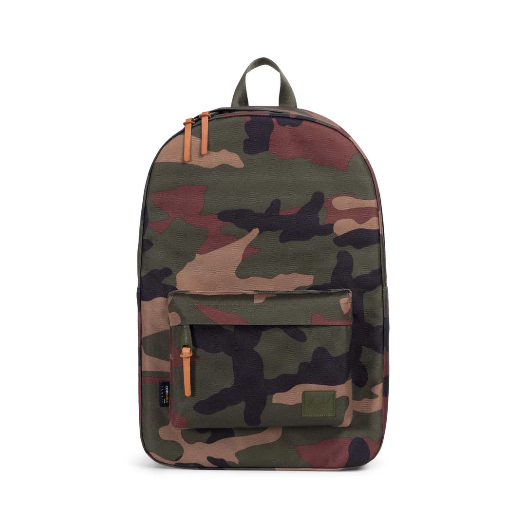 Classic compact backpack in custom Cordura with woodland camo print. Spacious main compartment for everyday essentials. Single front pocket with key clip. Fully padded sleeve for laptops up to 13”.