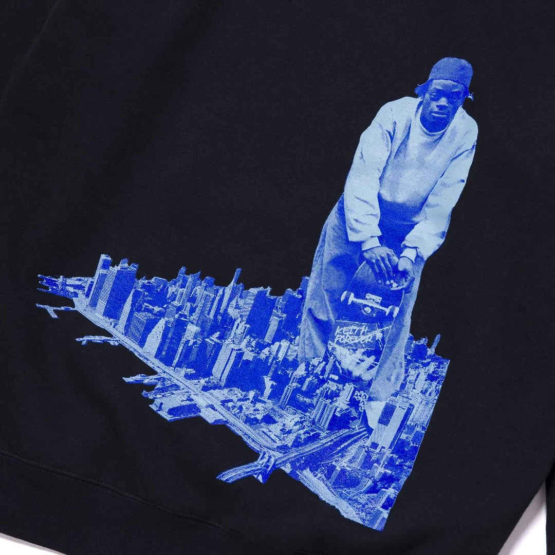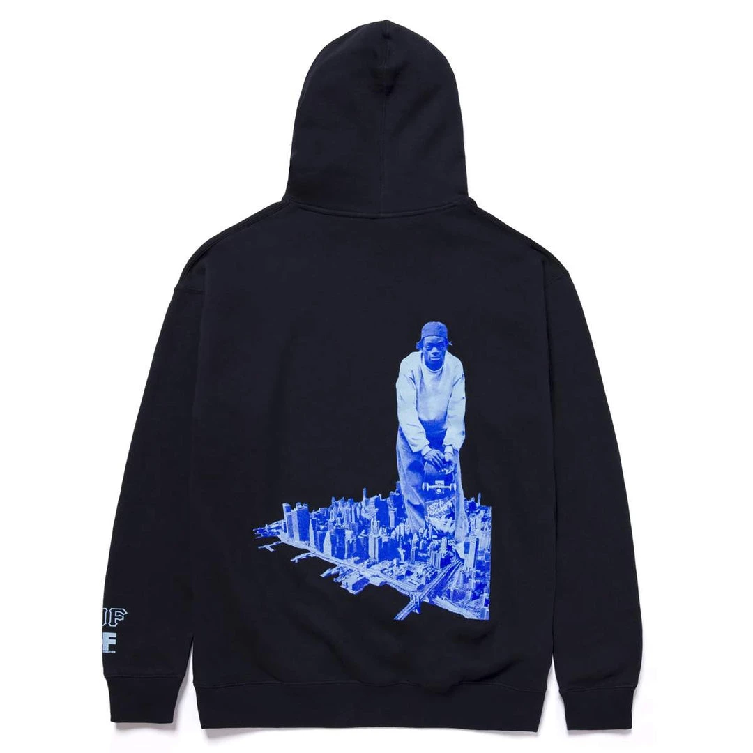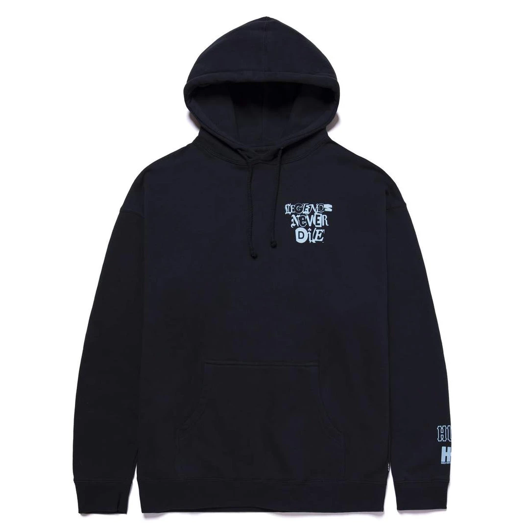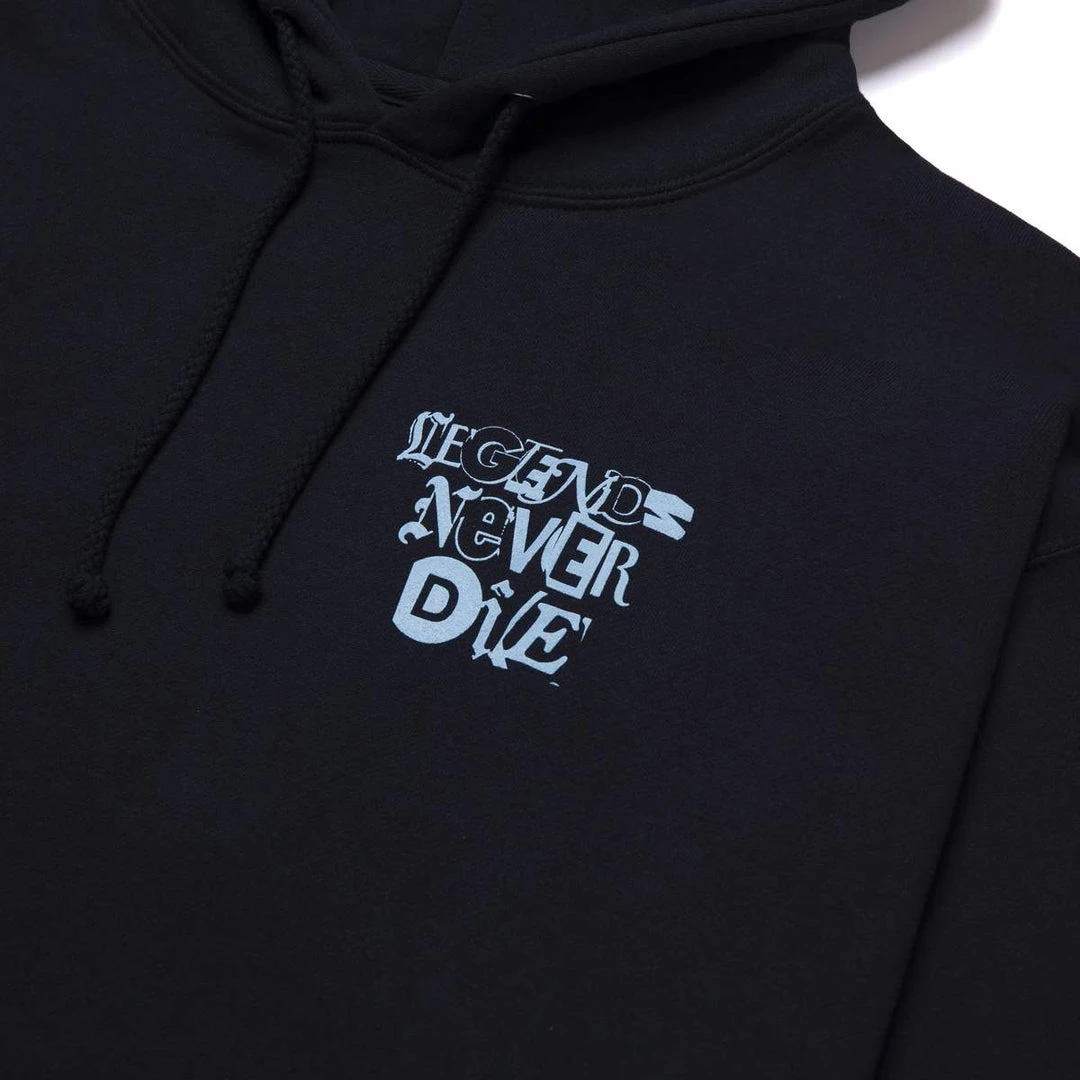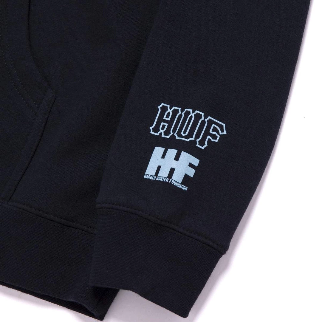 “RIP Harold Hunter…legends never die”. HUF teams with the Harold Hunter Foundation to pay homage to the legendary skater.  This limited edition collection supports underprivileged NYC youth by highlighting skateboarding. Features “Legends Never Die” slogan at left chest, portrait of Harold on the back, and HUF x HHF logs on the left wrist. Super soft pullover hoodie with kangaroo pocket and adjustable drawcord hood.