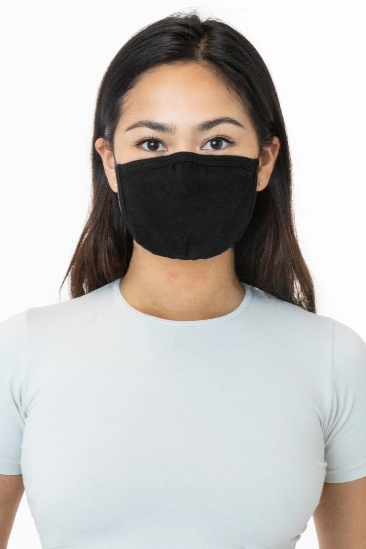 100% cotton black face mask which features an adjustable nose that you can form to the contours of your face. 2 straps to be worn around the head and neck that can be tied and tightened to preferred fit. Mask is made of a thick French Terry fabric.