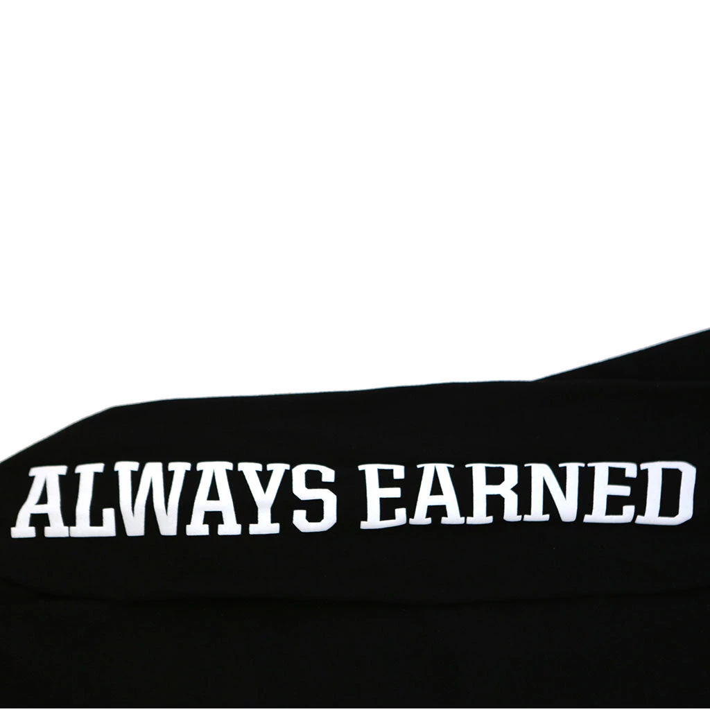 Long sleeve black shirt features the Never Made logo on the left chest and across the back in celadon. “ALWAYS EARNED” appears in white down both arms.