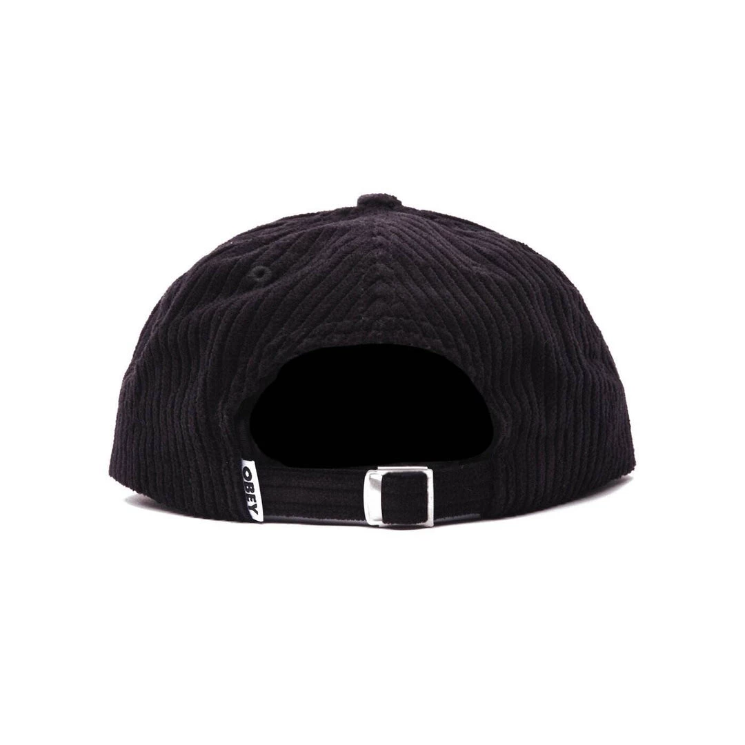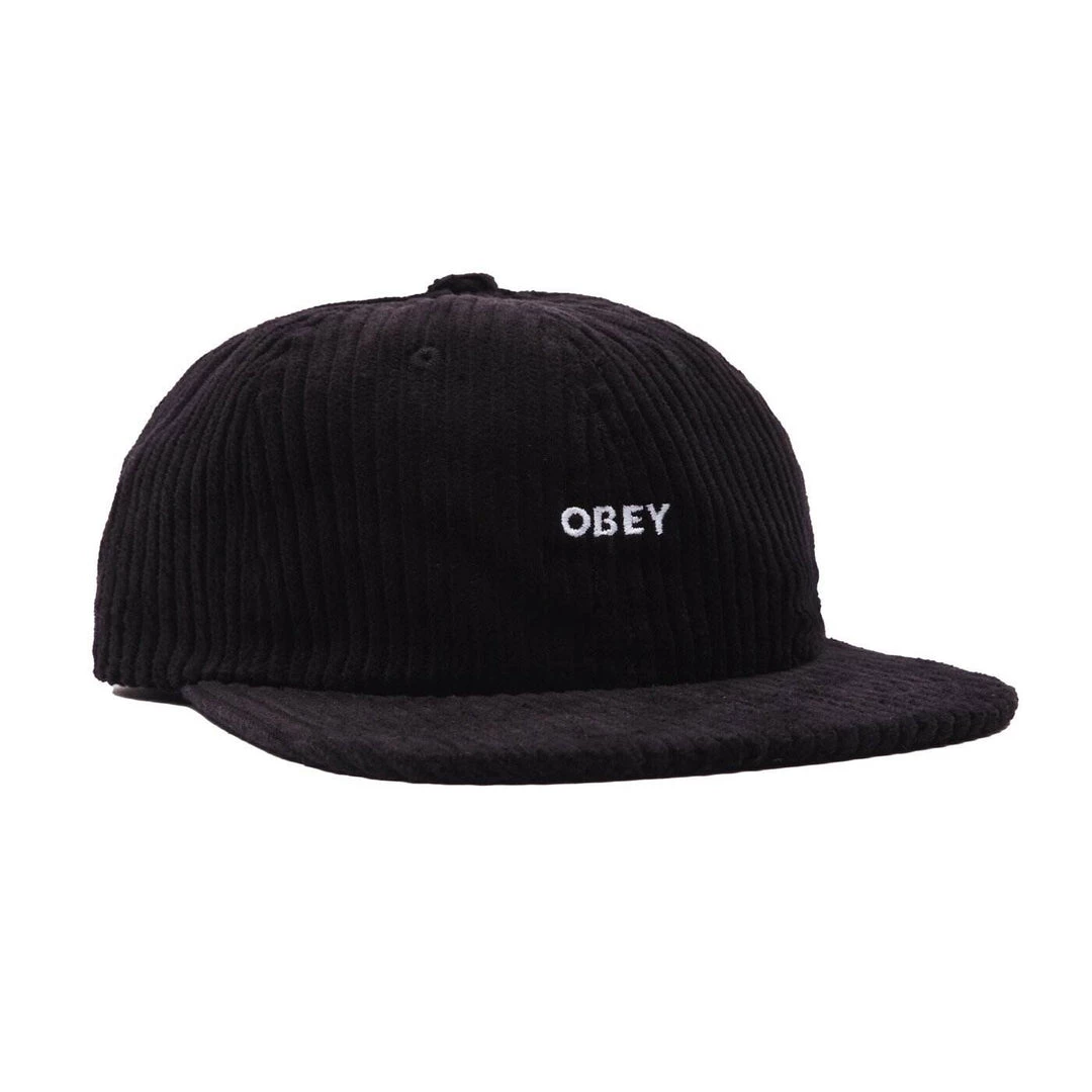 Low profile 6 panel corduroy snapback in classic black. Embroidered Obey logo, flat visor, and adjustable closure. Â