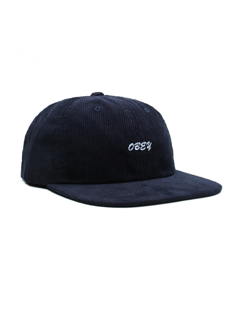 Mid profile navy corduroy strapback. Â Direct logo embroidery and adjustable plastic closure. Â