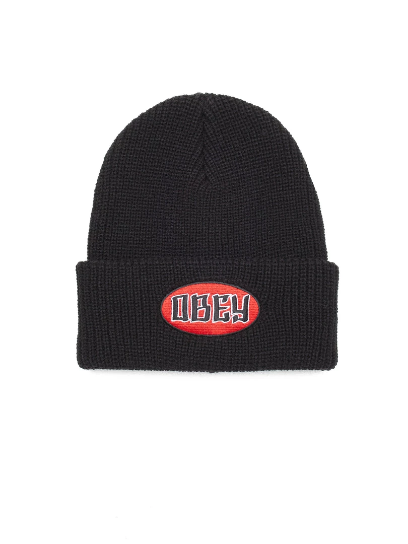 Tight knit beanie with rolled cuff and Obey embroidered patch.  Obey logo on bright red background. Â