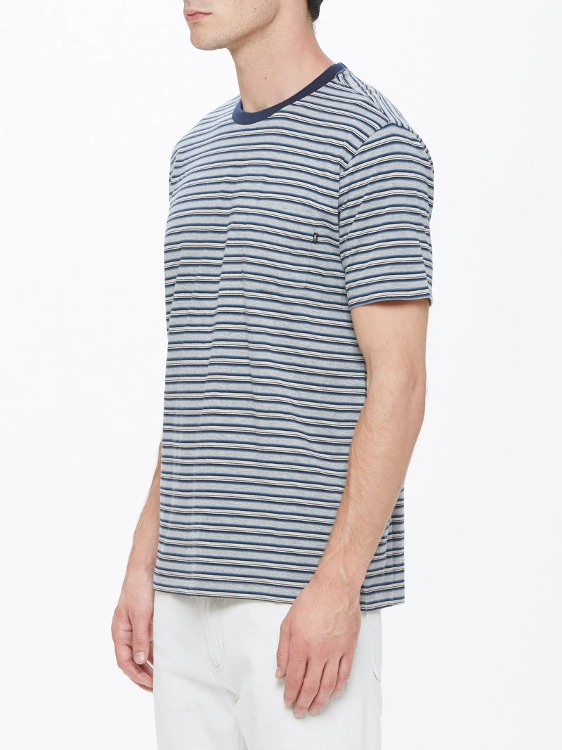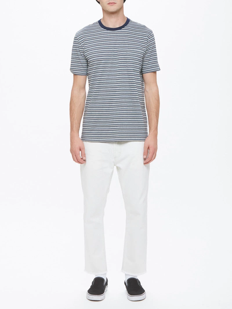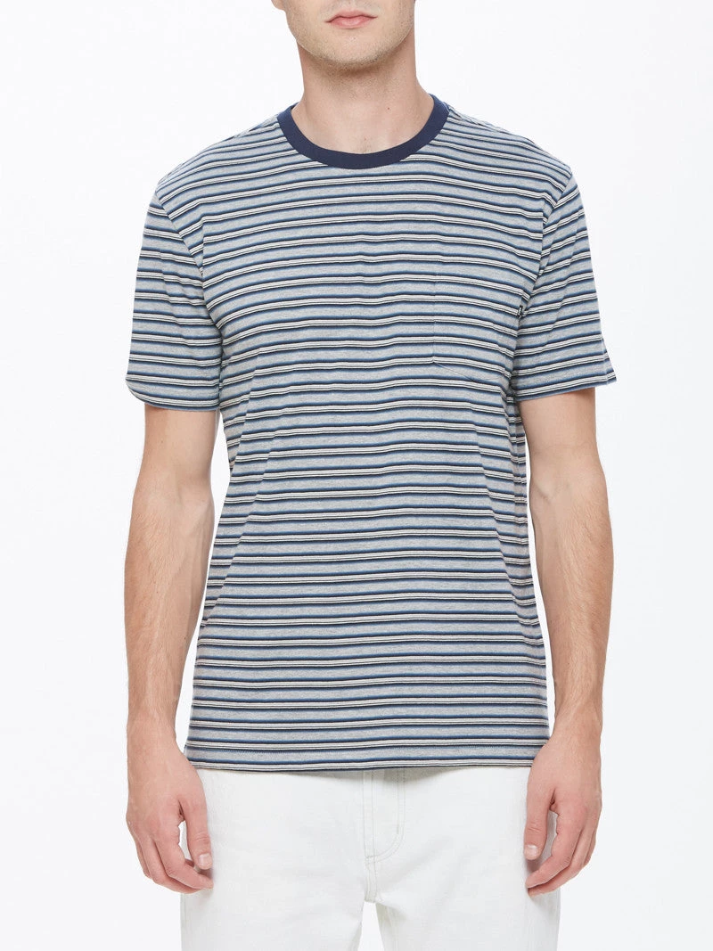 Regular fit tee with solid ribbed blue trim. Features yarn dyed stripe fabric and single chest pocket. OBEY custom label at pocket.
