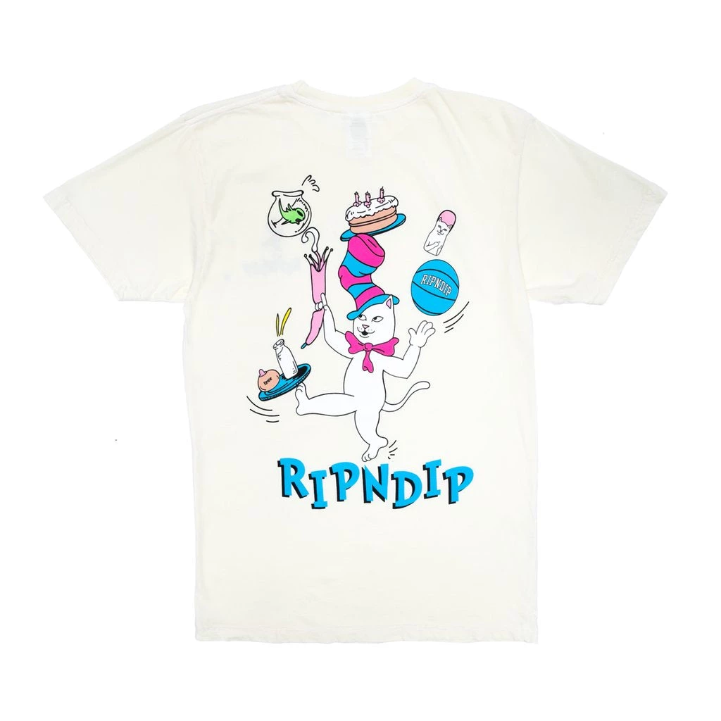 “My tricks are not bad, but that is not all.” RIPNDIP pays homage to a classic childhood character with a Nermal twist.  Custom screen printed graphic featuring Nermal In The Hat juggling a bag of tricks. Â