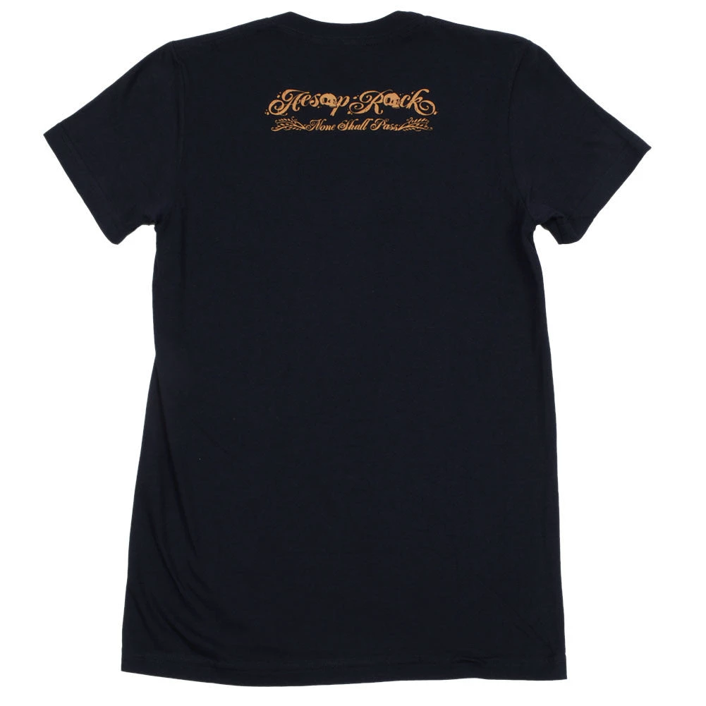 Aesop Rock tee designed by visual artist Jeremy Fish in support of Aesop’s effort, “None Shall Pass”. Printed on American Apparel 2102 (boy cut).