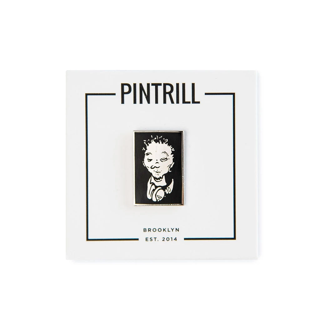 DEL partnered with Pintrill to celebrate the 25th Anniversary of his second album, No Need For Alarm. Del’s self portrait illustration from the iconic album cover as a silver and black pin with rubber backing. Back stamped with Hieroglyphics logo. Limited edition.