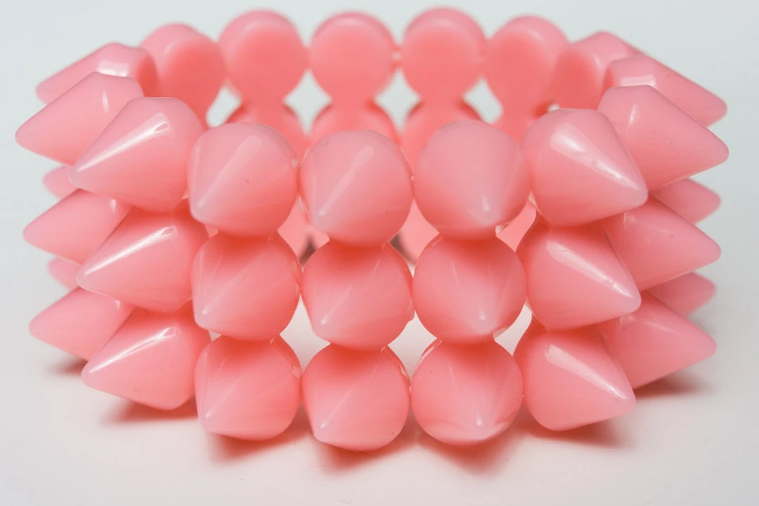 The Rainbow Starr Valentina bracelet features baby pink acrylic spikes on stretchy elastic. Â Bold, foxy and FUN!!! Â Looks extra cute when layered with other Rainbow Starr spike bracelets!!! Â