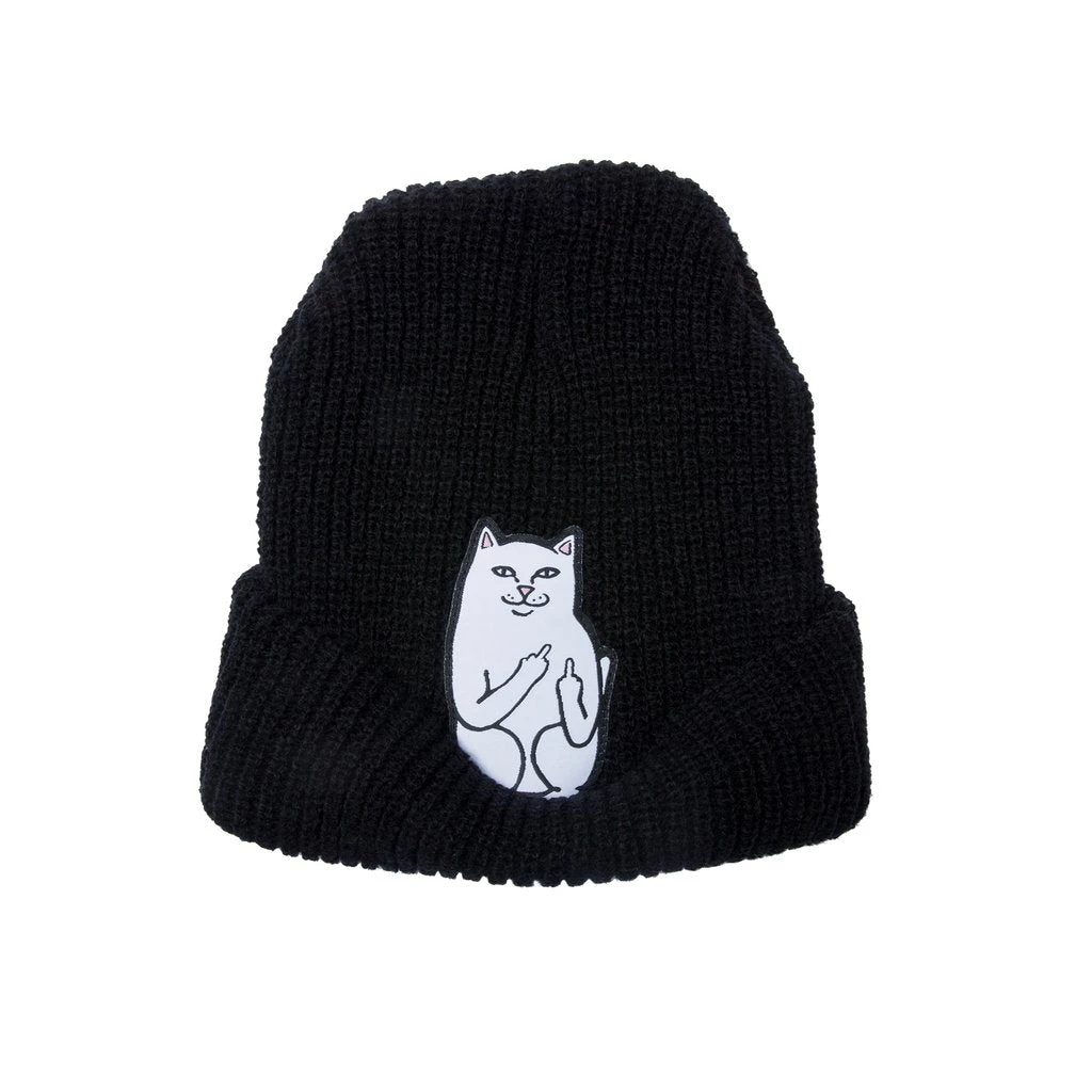 Ribbed acrylic black beanie with custom Nermal patch underneath the cuff.Â