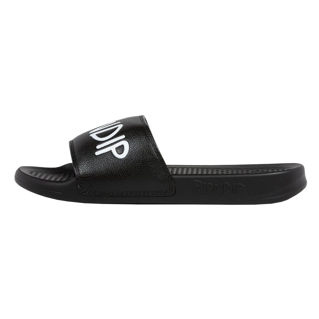 Relax and put your feet up with classic RIPNDIP slides. Features a simple RIPNDIP logo on black synthetic leather strap sandals. Cushioned footbed with branded logo on heel and herringbone tread for extra grip.