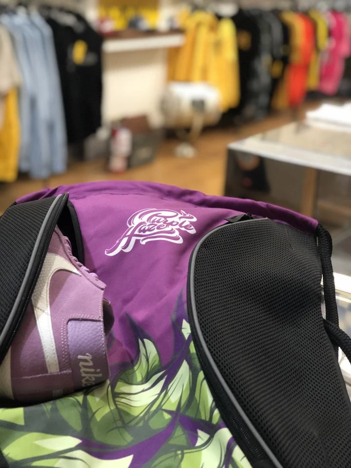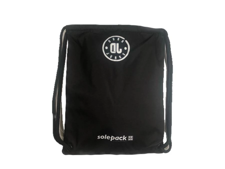 Solepack collab with German brand, Dunk Junks. Their version of the string bag with separate zippered compartments for shoes. One side is purple with green leaves and black pockets. The other side is black with logos from both brands. Black drawstring cords. Can be worn with either side facing out. Fits up to size 13-14 men’s shoe. Heavy duty poly.