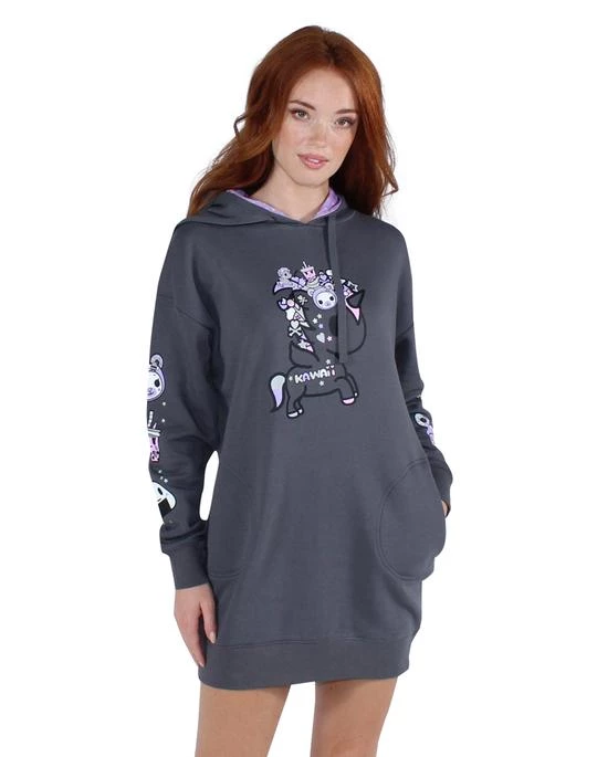 Take a magical ride in the sky among the stars and good friends. Features Tokimeki Unicorno on a custom hoodie dress with iridescent foil accents. Kawaii characters adorn both arms and skull and crossbones logo on the back neck. Lavender star interior hoodie lining and two side pockets.