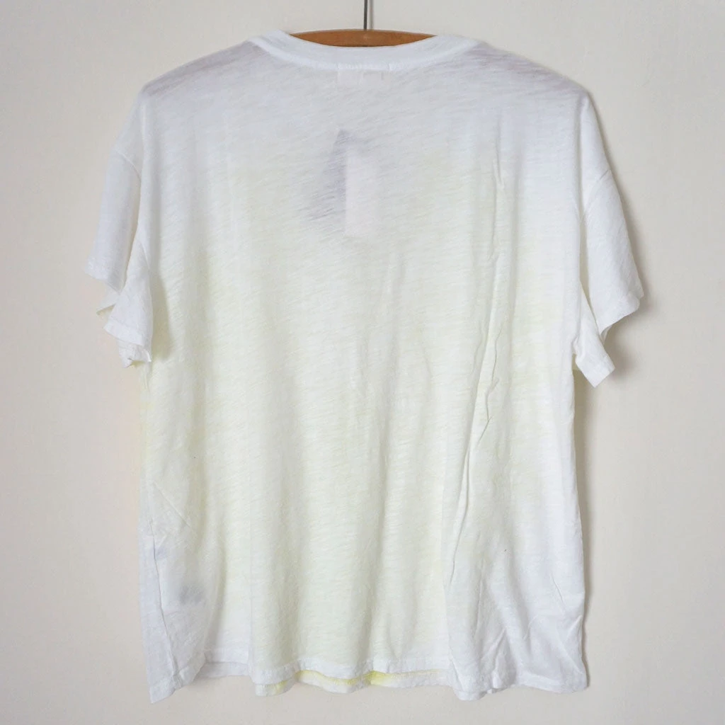Relaxed white top with large yellow tie dye top with subtle flutter sleeves. Slight hi-lo hem.