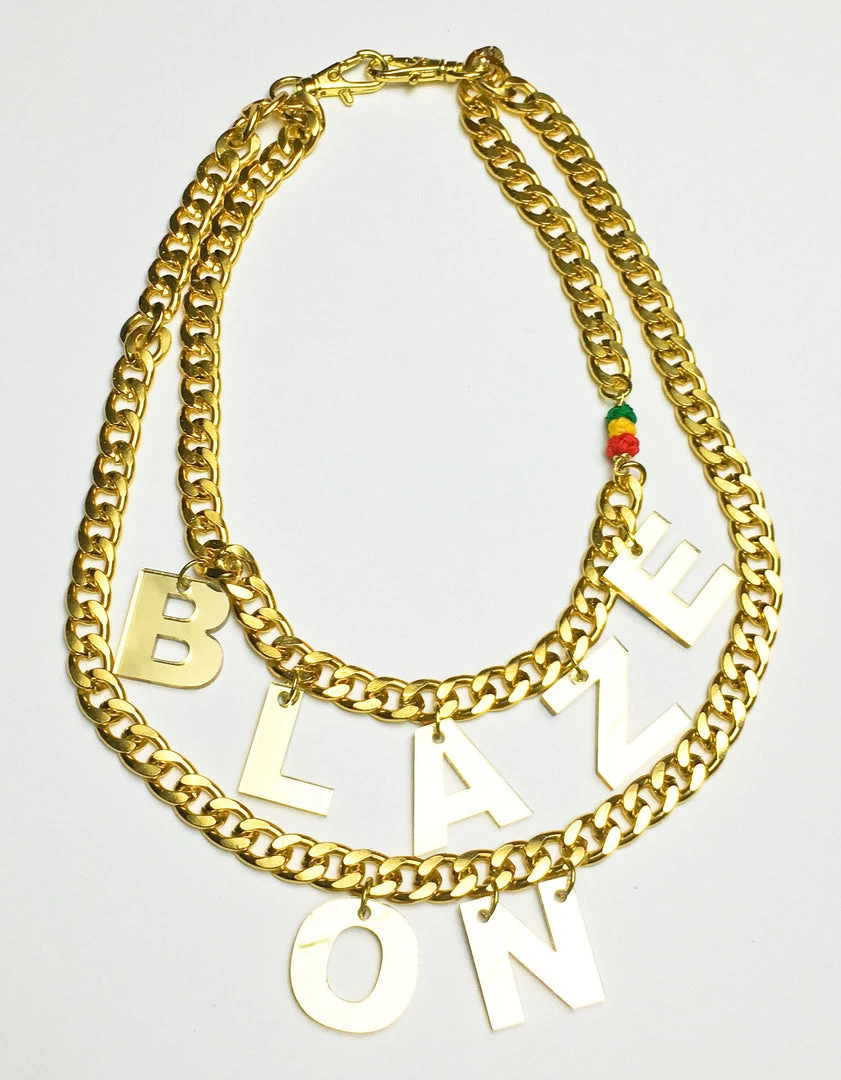 The golden reminder to BLAZE ON in life! Â Â Features acrylic gold mirror letters with blingy gold chain and knotted rasta beads. Â Shortest chain measures 16″ and longest chain measures 20″. Â