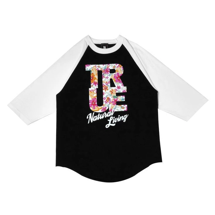 TRUE raglan shirt features screenprint in floral 2 logo print on a black baseball shirt with white sleeves.