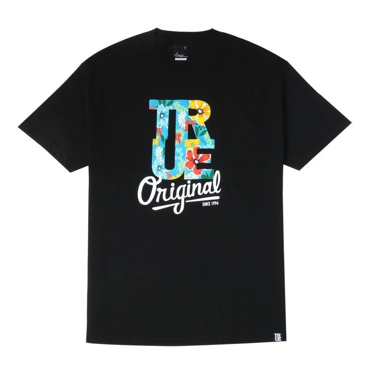 TRUE tee shirt features screenprint in floral logo print, small True logo tag on hem