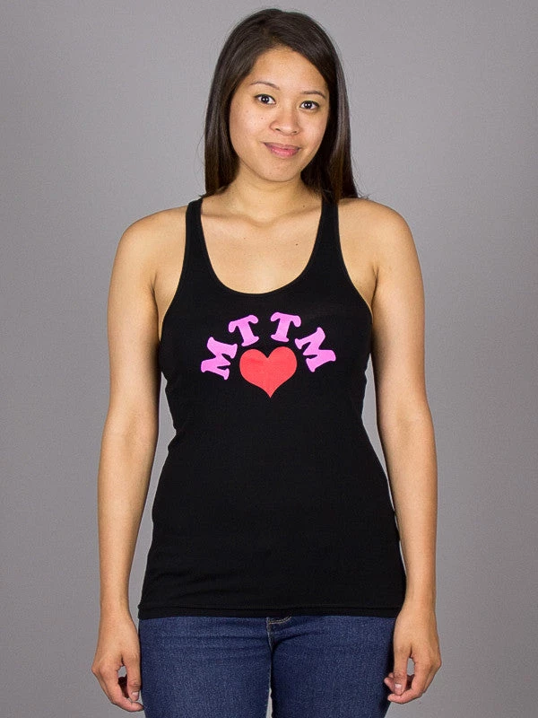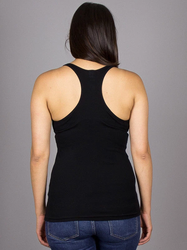 Racer back tank top featuring a front side screen print design.