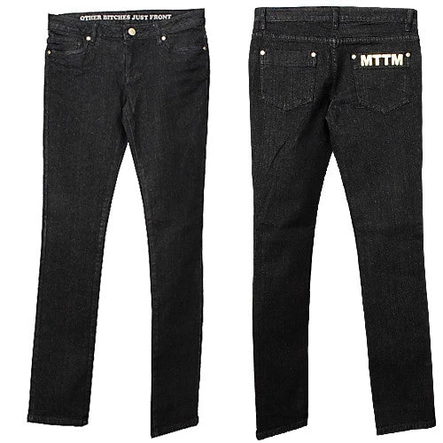 Perfect black jeans. Â The right rear pocket says, “MTTM” and the inner waistband says, “Other bitches just front”.