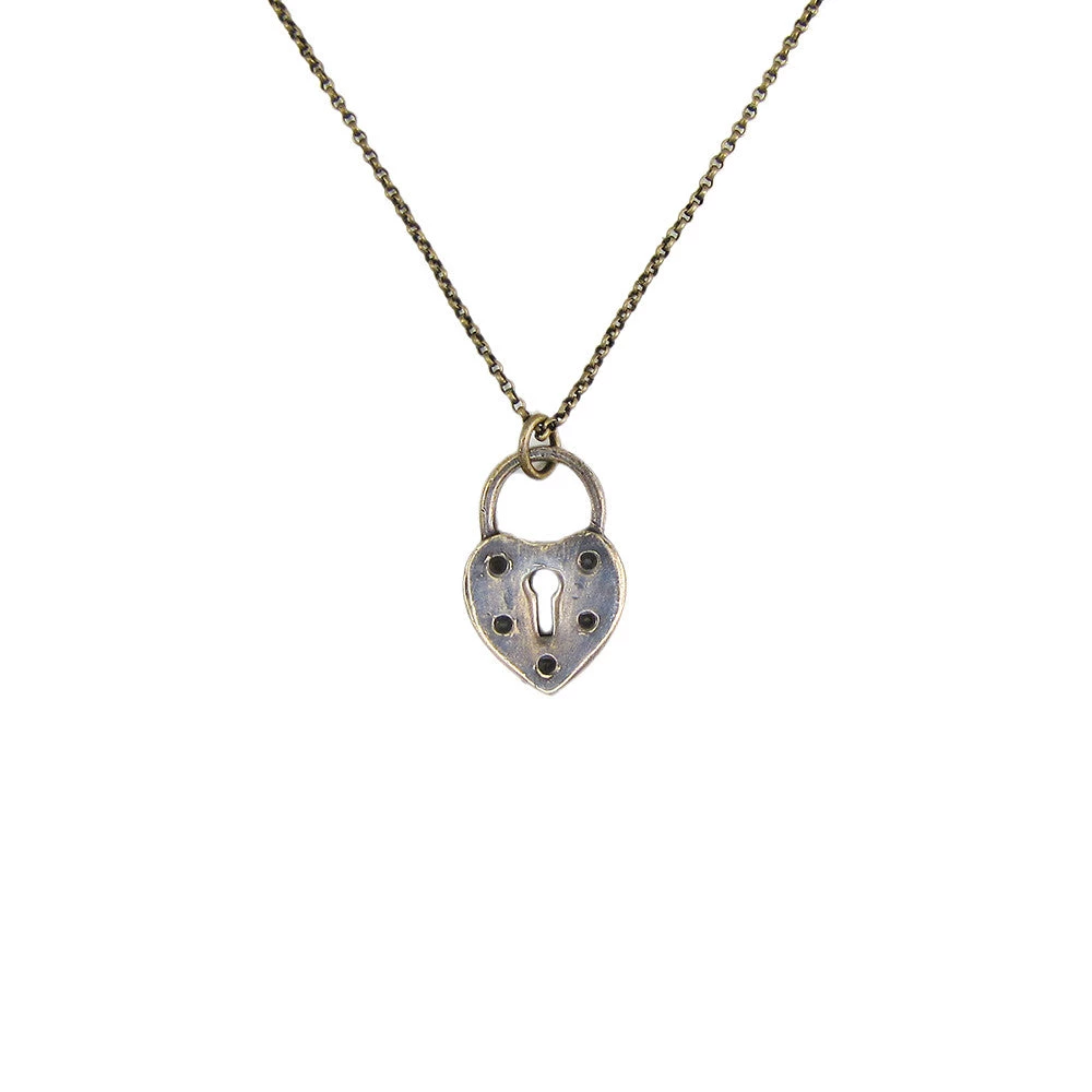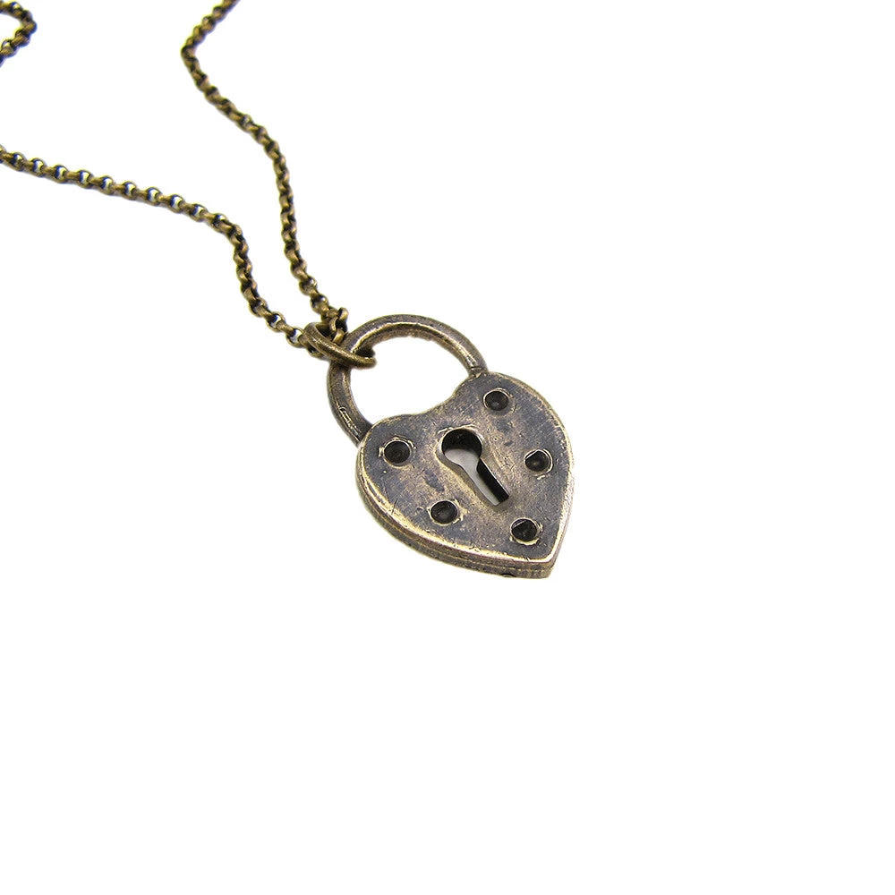 Keep your heart under lock and key. Heart lock pendant on 18″ aged brass chain. Heart measures approximately 1/2″ across.