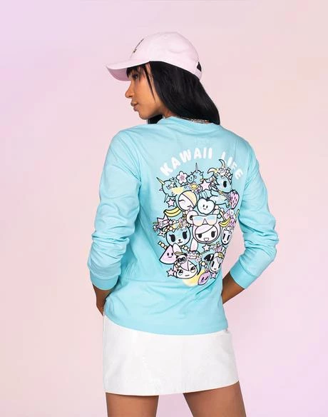 Donutella & Her Sweet Friends spring into the season! Features Donutella on the left chest and a kawaii cast of characters on the back. tokidoki skull and crossbones on the back of the shirt with “Kawaii Life” written in Japanese down the right sleeve.
